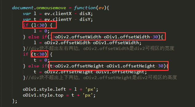 下面if判断是为了增加吸附功能,当div1靠近div2的边框距离小于30个像素时,直接将距离置为零。