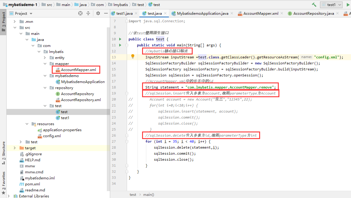 新建好数据库表单t_account之后,在AccountMapper.xml文件中进行配置,代码如下。代码中,namespace给出该文件路径,id给出在方法中调用时的statement参数,java通过该参数识别到该标签,同时识别到该标签下的SQL语句,对数据库进行增删改查操作;代码中实现了插入和删除的操作。parameterType是调用函数进行数据库操作时传入的参数类型。注意,编写好AccountMapper.xml后,要在config.xml总配置文件中引入。