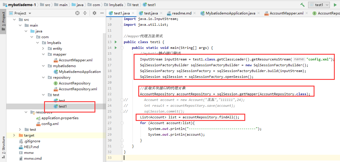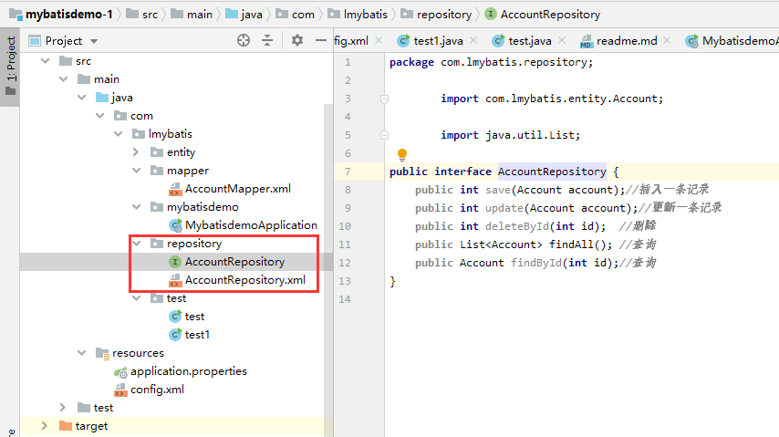 下面测试代理接口开发方式。使用的是AccountRepository接口中定义的方法(函数),如下: