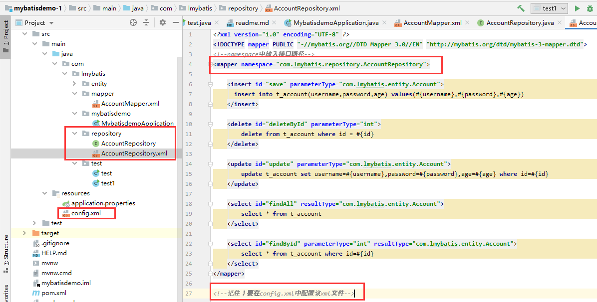 每一个数据库表单,都设置一个代理接口,比如Account类中有t_account表单的{id username password age}字段,那么单独为Account设置一个AccountRepository接口,接口中定义增、删、改、查的函数,之后再在AccountRepository.xml配置数据库操作。一般来说,应该为每个AccountRepository接口编写相应的AccountRepository.xml。