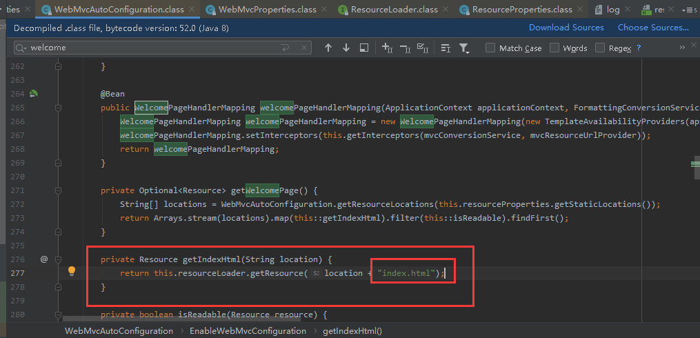 2.欢迎页,参考WebMvcAutoConfiguration类下的welcomePageHandlerMapping。当直接输入localhost:8080时,跳出一个欢迎页面。 随便在静态资源下放一个index.html,访问localhost:8080都可以跳出来。