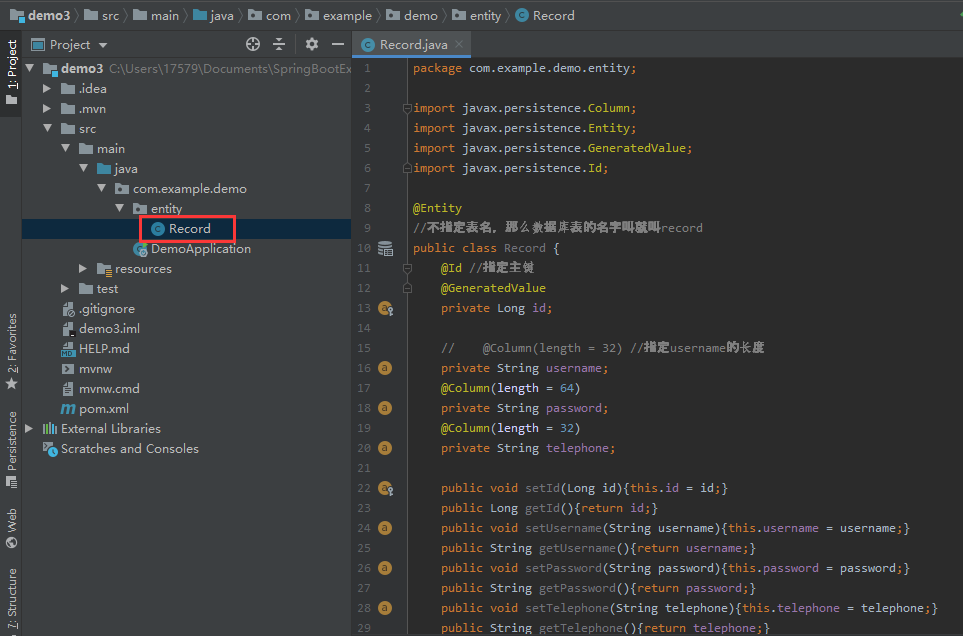 3.在entity下面新建一个Java class类,命名为Record,输入以下代码