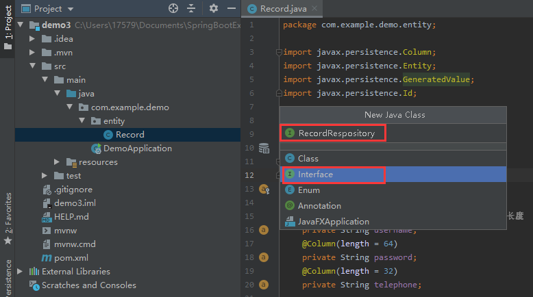 4. 在entity下面新建一个接口RecordRepository(下图拼写错误,是RecordRepository),接口代码如下