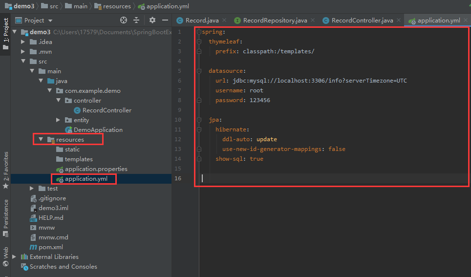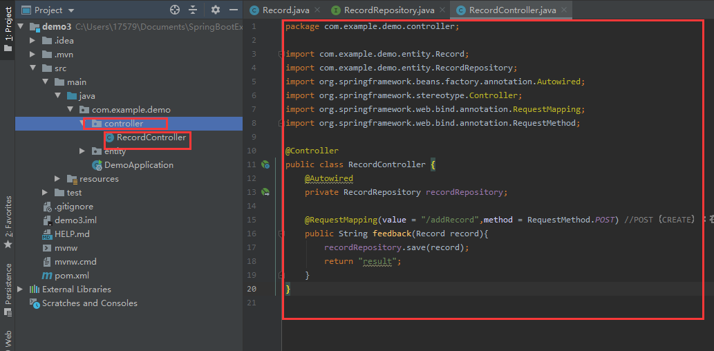 5.新建一个controller包,包下新建一个RecordController类,类中代码如下