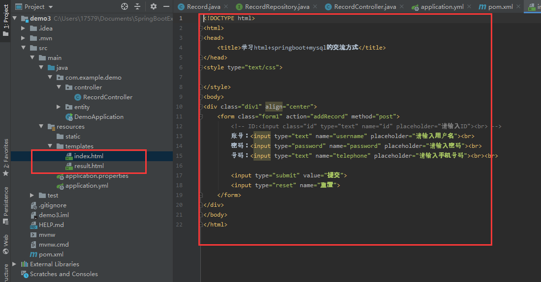8. 在templates文件夹下新建两个html文件:index.html和result.html