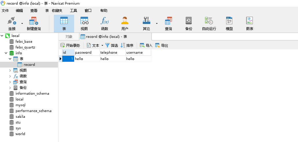 访问localhost:8080,都输入hello,点击提交。之后在navicate中刷新,可以发现info数据库自动创建了一个record表,且个字段都已经添加进去了