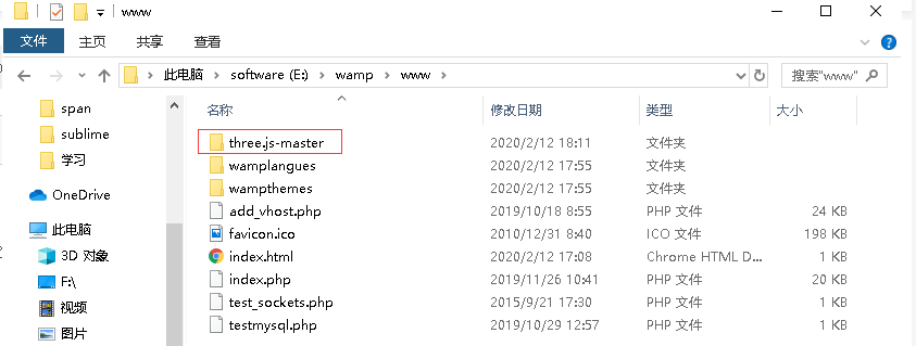 2.从https://github.com/mrdoob/three.js/下载threejs,将解压后的文件放入安装文件下的www文件夹下