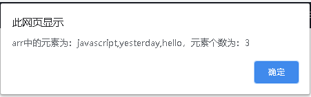 <!DOCTYPE html> <html> <head> <title>字符串分割</title> <script type="text/javascript"> var str = "javascript yesterday hello"; var arr = str.split(" "); alert("arr中的元素为:"+arr+",元素个数为:"+arr.length); </script> </head> <body> </body> </html>结果