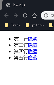 <body> <ul id='ul1'> <li>第一行<a href="javascript:">隐藏</a></li> <li>第二行<a href="javascript:">隐藏</a></li> <li>第三行<a href="javascript:">隐藏</a></li> <li>第四行<a href="javascript:">隐藏</a></li> <li>第五行<a href="javascript:">隐藏</a></li> </ul> </body>