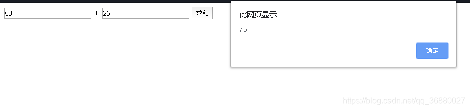 <!DOCTYPE html> <html> <head> <title>innerHTML</title> <style type="text/css"> </style> <script type="text/javascript"> window.onload = function(){ var oTxt1 = document.getElementById('txt1'); var oTxt2 = document.getElementById('txt2'); var oBtn = document.getElementById('Btn'); oBtn.onclick = function(){ alert(parseInt(oTxt1.value)+parseInt(oTxt2.value)) }; }; </script> </head> <body> <input id="txt1" type="text"> + <input id="txt2" type="text"> <input id="Btn" type="button" value = "求和"> </body> </html>效果: