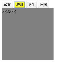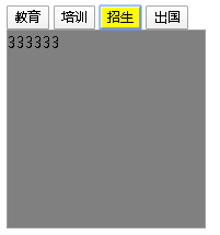 <!DOCTYPE html> <html> <head> <title>111</title> <style type="text/css"> .active{ background-color: yellow; } div{ width: 200px; height: 200px; background-color: gray; border: 1px solid #999; display: none; } </style> <script type="text/javascript"> window.onload = function(){ var aBtn = document.getElementsByTagName('input'); var aDiv = document.getElementsByTagName('div'); for (var i = 0; i < aBtn.length; i++) { aBtn[i].index = i; aBtn[i].onclick = function(){ for (var i = 0; i < aBtn.length; i++) { aBtn[i].className = ""; aDiv[i].style.display = "none"; } this.className = "active"; aDiv[this.index].style.display = "block"; } } } </script> </head> <body> <input class="active" type="button" value="教育"> <input type="button" value="培训"> <input type="button" value="招生"> <input type="button" value="出国"> <div style="display: block;">111111</div> <div>222222</div> <div>333333</div> <div>444444</div> </body> </html>4.效果