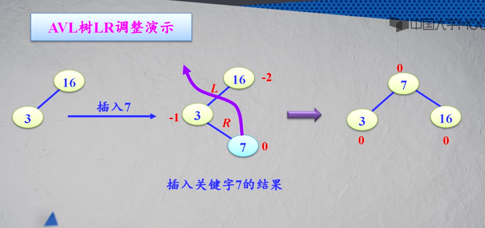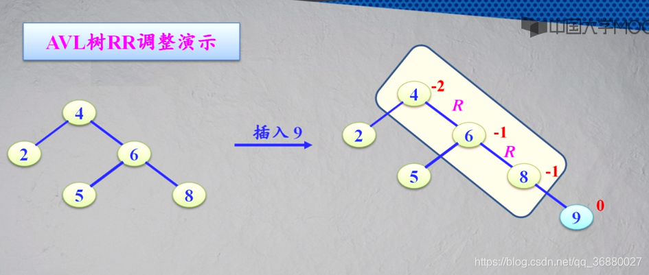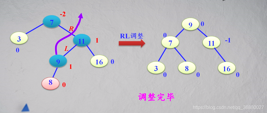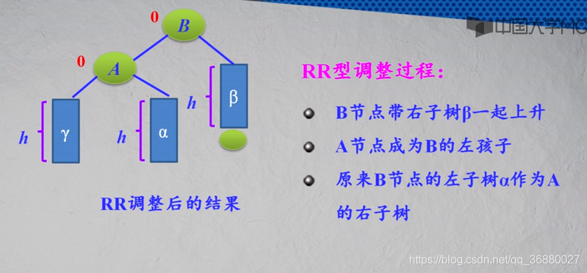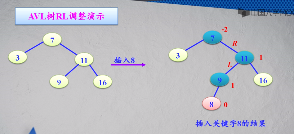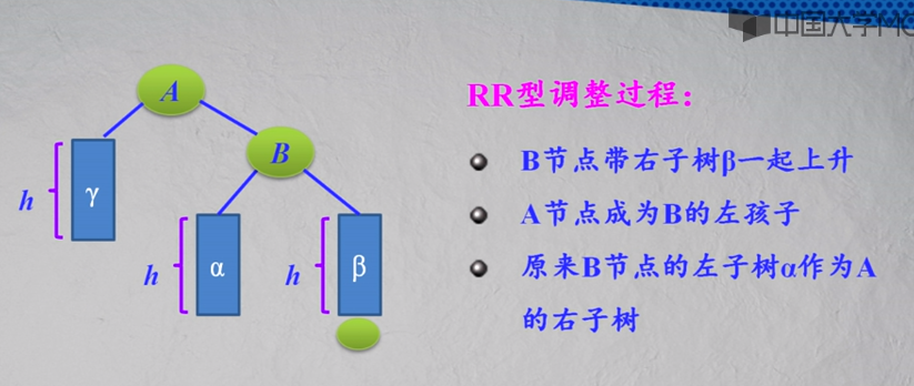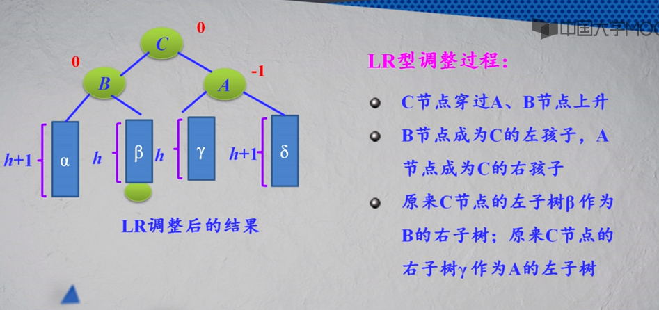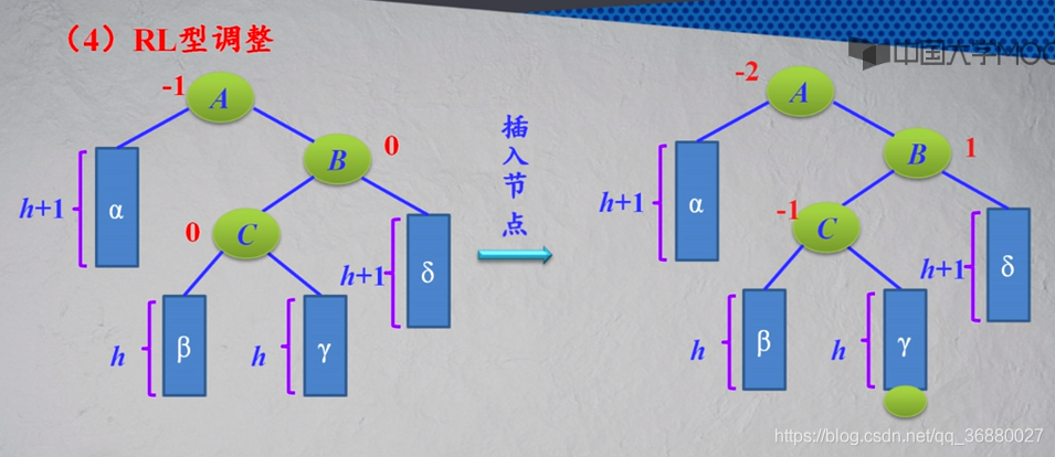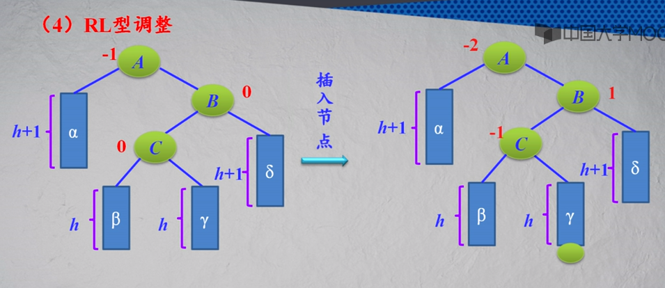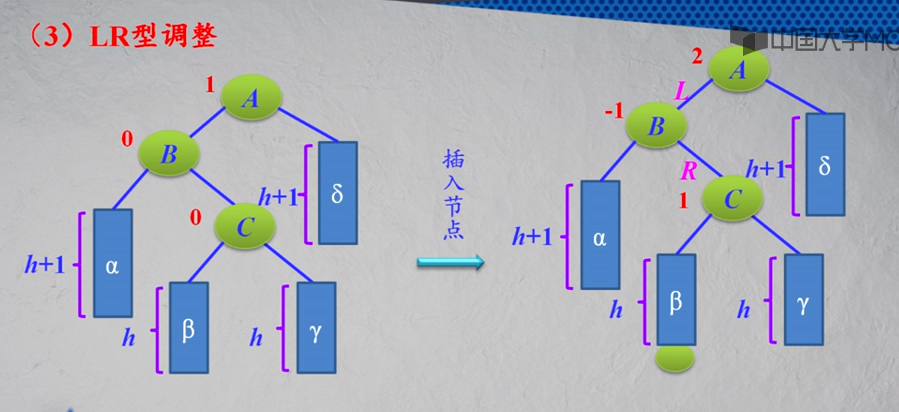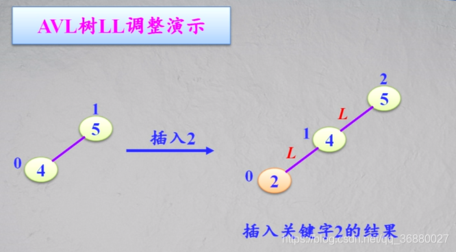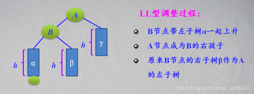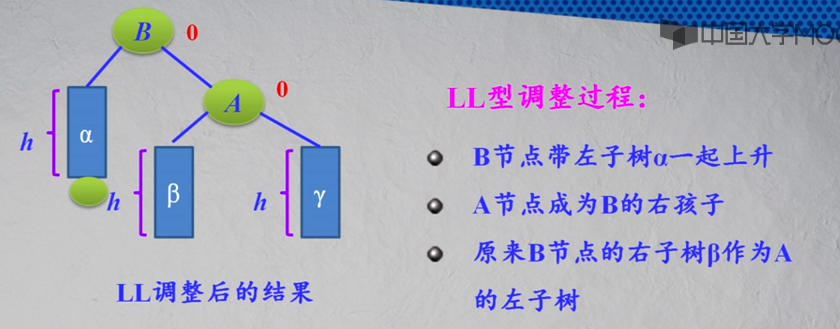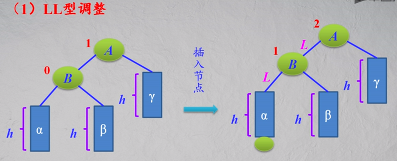 平衡二叉树是一棵任意节点的左子树深度减去右子树深度的绝对值不大于1的二叉排序树,当在一棵平衡二叉树上插入新的节点时,往往会导致二叉树失去平衡,此时二叉树需要进行调整。下面是四种调整情况: