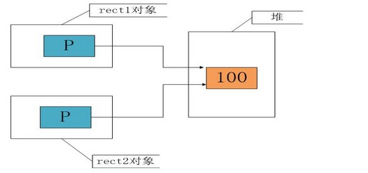 在使用rect1复制rect2时,由于执行的是浅拷贝,只是将成员的值进行赋值,这时 rect1.p = rect2.p,也即这两个指针指向了堆里的同一个空间,如下图所示: