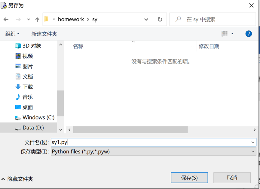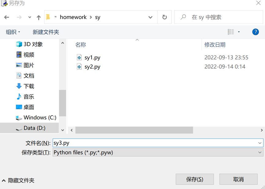 - 在IDLE中创建一个名称为:sy1.py的文件(按CTRL+S保存)