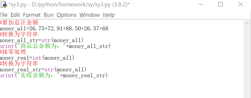2.然后在该文件中,首先将各个商品金额累加,计算出商品总金额,后转换为字符串输出(str表示字符串类,str()可将变量强制转换为字符串的函数),后再应用Int()函数将浮点型的变量转换为整型,进而实现抹零,同时将其转换为字符串输出。代码如下