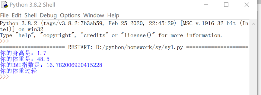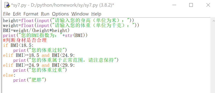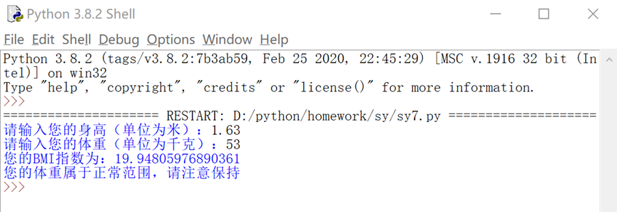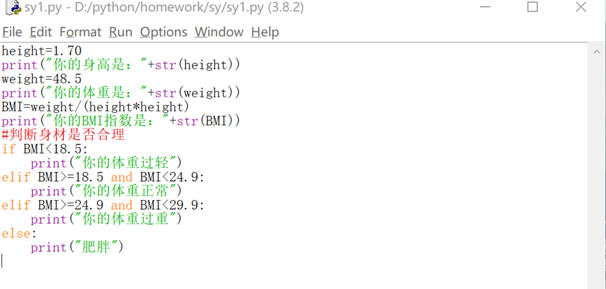 - 根据实例1,修改为使用input()函数来对身高体重进行输入。代码如下