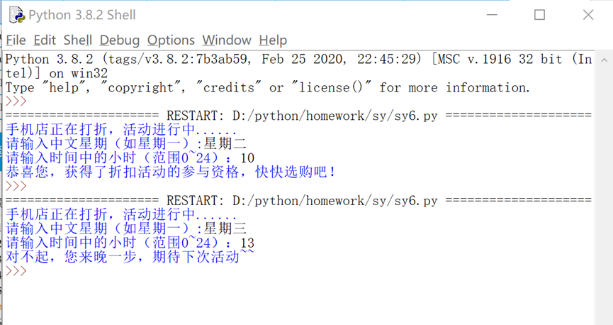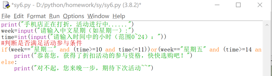 - 后在该文件中,用代码实现参与手机店的打折活动的描述场景:某手机店在每周二的上午10点至11点和每周五的下午14点至15点,对华为Mate10系列手机进行折扣让利活动,那么想参加活动的顾客,就要在时间上满足两个条件:周二10:00am~11:00am,周五2:00~3:00pm。代码如下。