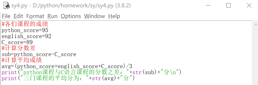 2.首先定义三个变量,用于存储各门课程的分数,然后应用减法运算符计算分数差,再应用加法运算符和除法运算符计算平均成绩。代码如下。