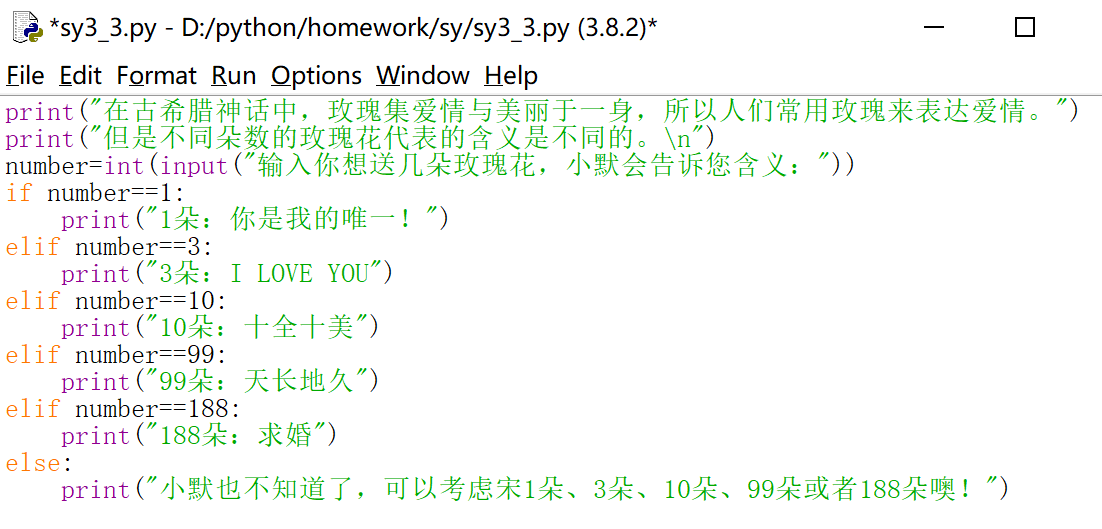 一、实验要求与目的:使用if...elif...else多分支语句实现根据用户输入的玫瑰花的朵数输出其代表的含义