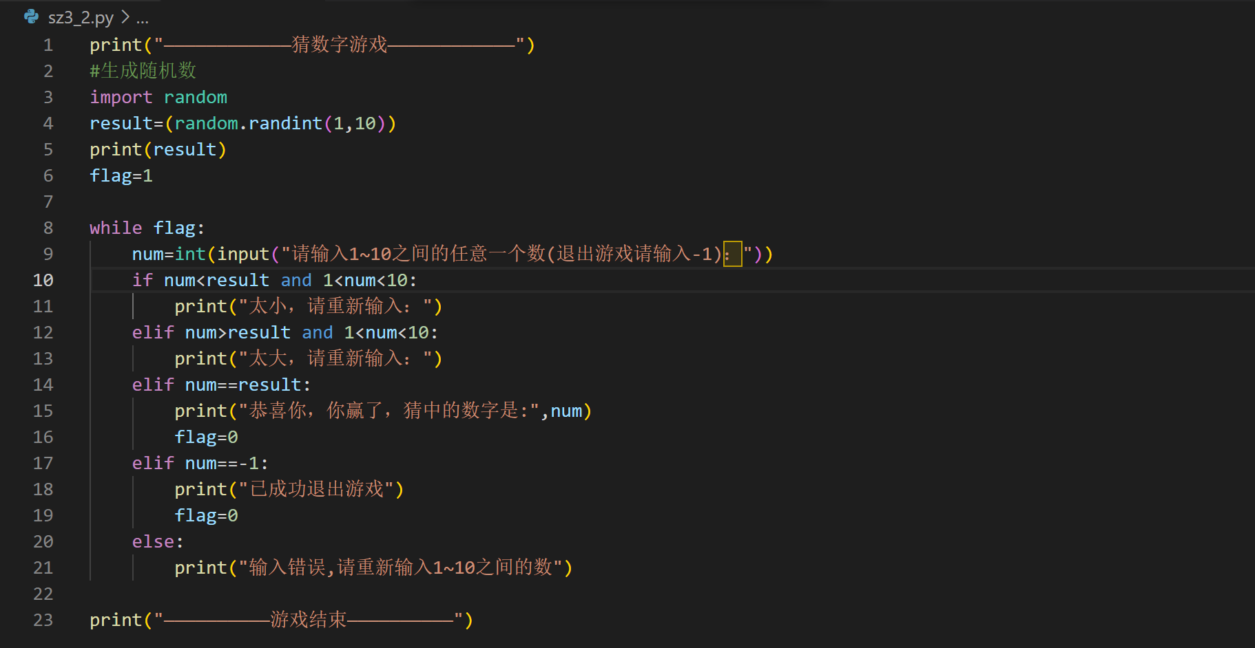 一、实验要求与目的:编写一个猜数字的游戏,随机生成一个1到10之间(包括1和10)的数字作为基准数,玩家每次通过键盘输入一个数字,如果输入的数字和基准数相同,则成功过关,否则重新输入。如果玩家输入-1,则表示退出游戏