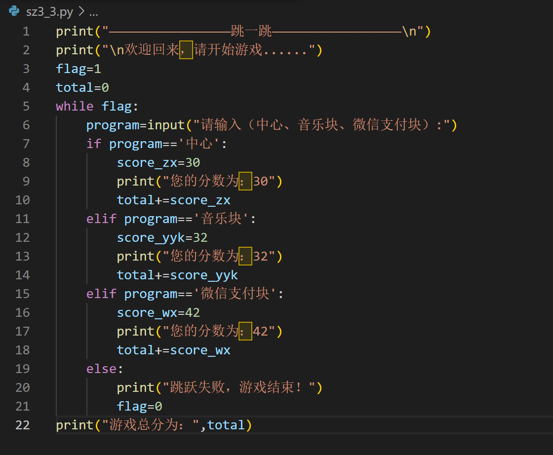 一、实验要求与目的:“跳一跳”小游戏中提供了一些加分块,当跳到这些加分块上时,会有额外的加分,本实战将模拟“跳一跳”小游戏,实现输入不同的加分快,显示应加的分数