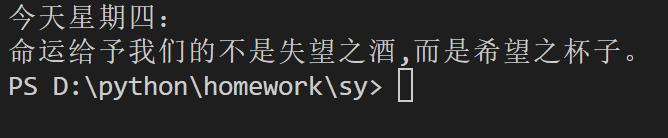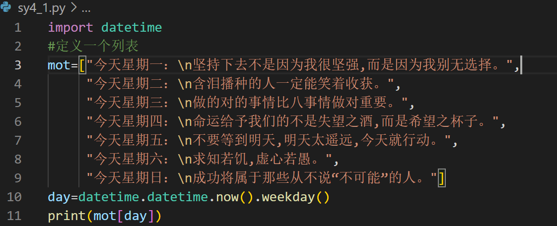 1.实验要求与目的:输出每日一贴:先创建一个文件,然后在该文件中导入日期时间类,然后定义一个列表(保存7条励志文字作为每日一贴的内容),再获取当前的日期,最后将当前的星期作为列表的索引,输出元素内容