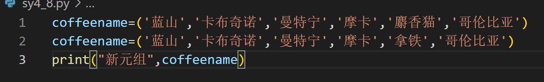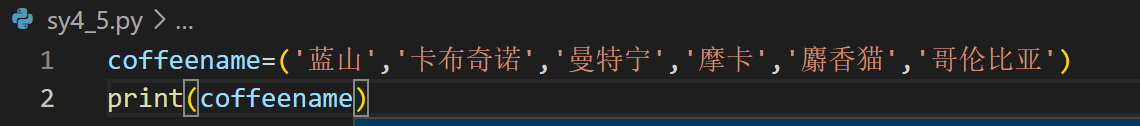 1.实验要求与目的:创建一个文件,定义一个包含6个元素的元组,内容为伊米咖啡馆例的咖啡名称,然后修改其中的第五个元素的内容为“拿铁”