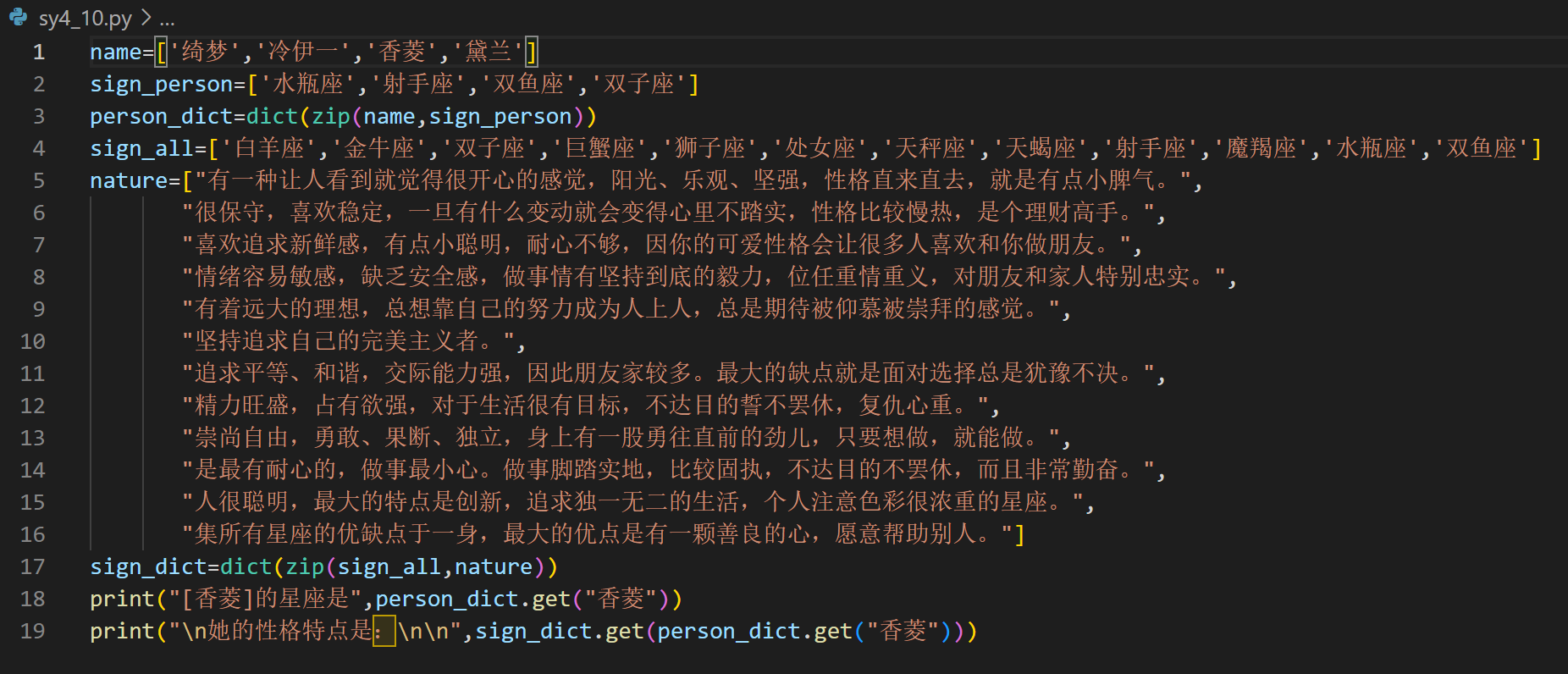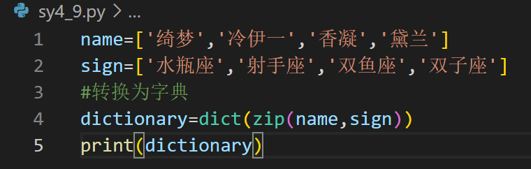 1.实验要求与目的:创建一个文件,然后在该文件中,定义两个包括4个元素的列表,再应用dict()函数和zip()函数将前两个列表转换为对应的字典,并且输出该字典