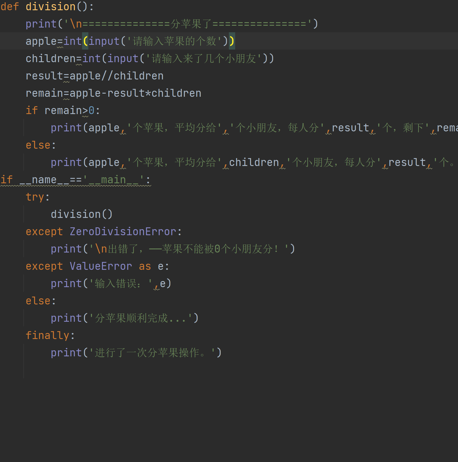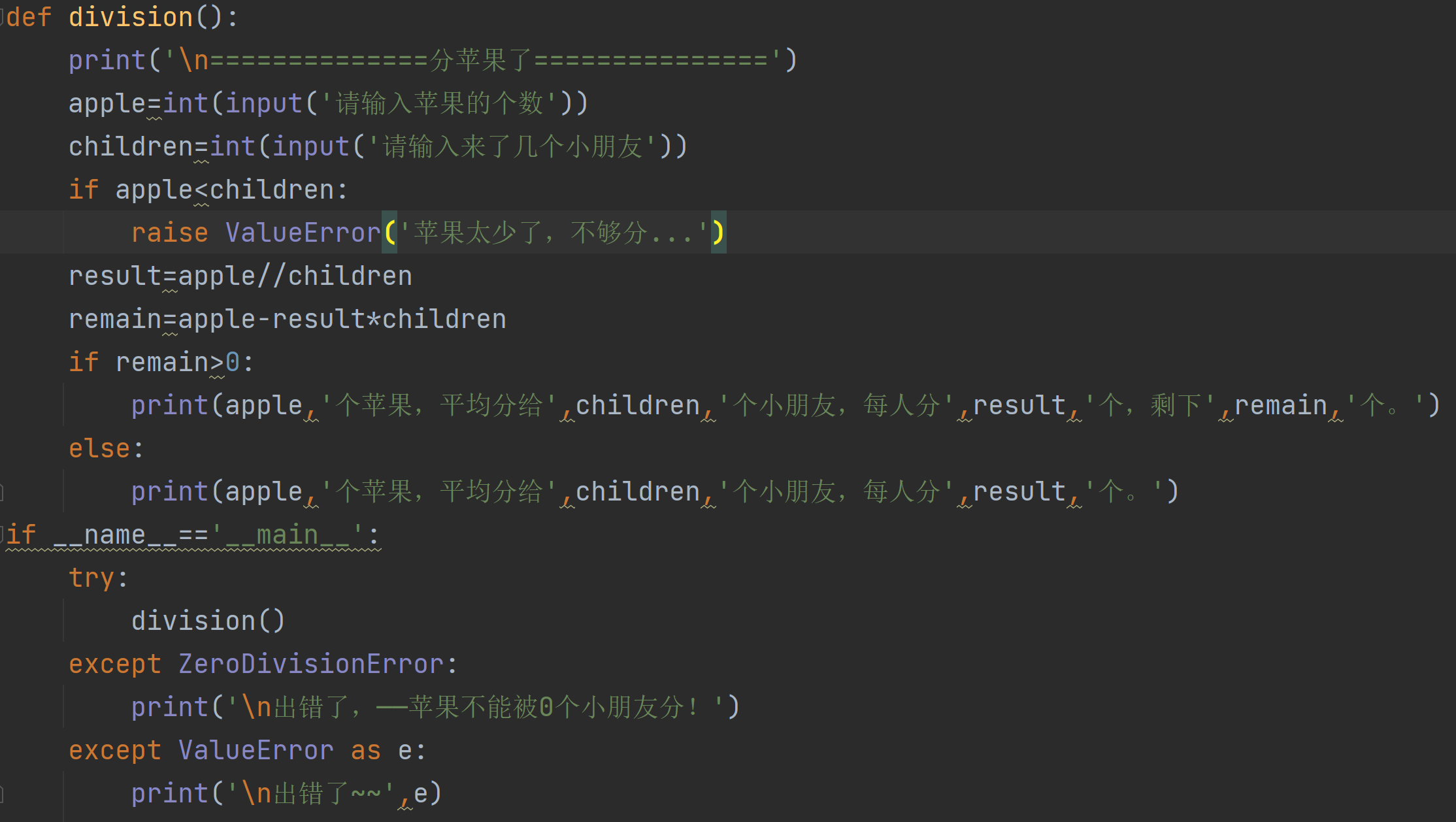 一、实验目的与要求:创建一个文件,然后将实例二的代码全部复制到该文件中,并且在第5行代码“children = int(input(" 请输入来了几个小朋友: "))” 的下方添加一个if语句,实现当苹果的数量小于小朋友的数量时,应用raise语句抛出-一个ValueError异常,接下来再在最后一行语句的下方添加except语句处理ValueError异常