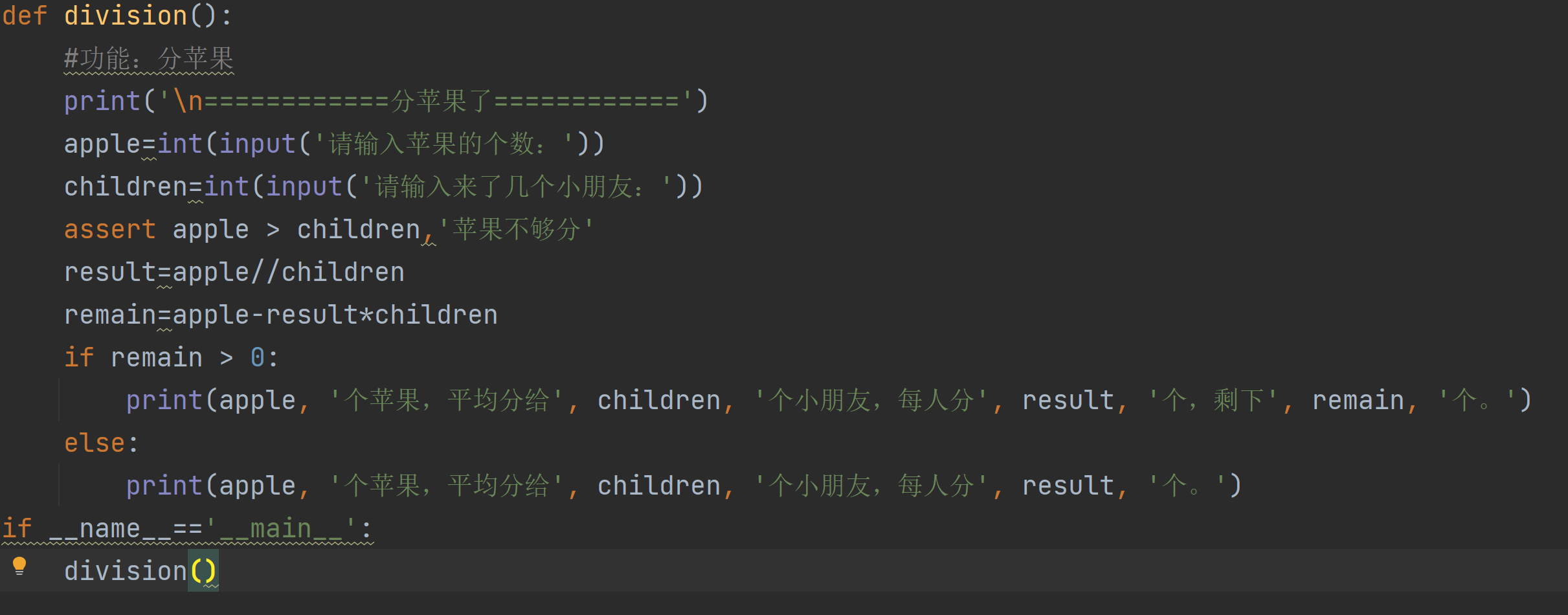 一、实验目的与要求:创建一个文件,然后再该文件中定义一个苹果的函数division(),在该函数中,要求输入苹果的数量和小朋友的数量,然后应用除法算式计算分配的结果,最后调用division()函数