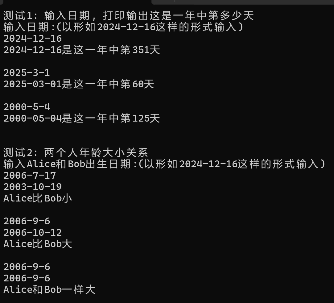 1 #include <stdio.h> 2 3 typedef struct { 4 int year; 5 int month; 6 int day; 7 } Date; 8 9 void input(Date *pd); 10 int day_of_year(Date d); 11 int compare_dates(Date d1, Date d2); 12 13 void test1() { 14 Date d; 15 int i; 16 17 printf("输入日期:(以形如2024-12-16这样的形式输入)\n"); 18 for(i = 0; i < 3; ++i) { 19 input(&d); 20 printf("%d-%02d-%02d是这一年中第%d天\n\n", d.year, d.month, d.day, day_of_year(d)); 21 } 22 } 23 24 void test2() { 25 Date Alice_birth, Bob_birth; 26 int i; 27 int ans; 28 29 printf("输入Alice和Bob出生日期:(以形如2024-12-16这样的形式输入)\n"); 30 for(i = 0; i < 3; ++i) { 31 input(&Alice_birth); 32 input(&Bob_birth); 33 ans = compare_dates(Alice_birth, Bob_birth); 34 35 if(ans == 0) 36 printf("Alice和Bob一样大\n\n"); 37 else if(ans == -1) 38 printf("Alice比Bob大\n\n"); 39 else 40 printf("Alice比Bob小\n\n"); 41 } 42 } 43 44 int main() { 45 printf("测试1: 输入日期, 打印输出这是一年中第多少天\n"); 46 test1(); 47 48 printf("\n测试2: 两个人年龄大小关系\n"); 49 test2(); 50 } 51 52 void input(Date *pd){ 53 scanf("%d-%d-%d",&pd->year,&pd->month,&pd->day); 54 } 55 56 int day_of_year(Date d){ 57 int days_in_month[] = {0, 31, 28, 31, 30, 31, 30, 31, 31, 30, 31, 30, 31}; 58 if (d.year % 4 == 0 && (d.year % 100!= 0 || d.year % 400 == 0)) { 59 days_in_month[2] = 29; 60 } 61 int day_count = 0; 62 int i; 63 for (i = 1; i < d.month; i++) { 64 day_count += days_in_month[i]; 65 } 66 return day_count + d.day; 67 } 68 69 int compare_dates(Date d1, Date d2){ 70 if (d1.year < d2.year) return -1; 71 if (d1.year > d2.year) return 1; 72 if (d1.month < d2.month) return -1; 73 if (d1.month > d2.month) return 1; 74 if (d1.day < d2.day) return -1; 75 if (d1.day > d2.day) return 1; 76 return 0; 77 }