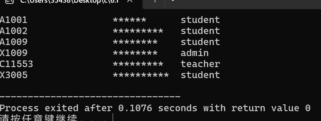 1 #include <stdio.h> 2 #include <string.h> 3 4 enum Role {admin, student, teacher}; 5 6 typedef struct { 7 char username[20]; 8 char password[20]; 9 enum Role type; 10 } Account; 11 12 void output(Account x[], int n); 13 14 int main() { 15 Account x[] = {{"A1001", "123456", student}, 16 {"A1002", "123abcdef", student}, 17 {"A1009", "xyz12121", student}, 18 {"X1009", "9213071x", admin}, 19 {"C11553", "129dfg32k", teacher}, 20 {"X3005", "921kfmg917", student}}; 21 int n; 22 n = sizeof(x)/sizeof(Account); 23 output(x, n); 24 25 return 0; 26 } 27 28 void output(Account x[], int n) { 29 int i,j; 30 for (i = 0; i < n; i++) { 31 printf("%-20s", x[i].username); 32 33 int len = strlen(x[i].password); 34 for (j = 0; j < len; j++) { 35 printf("*"); 36 } 37 printf("\t"); 38 printf("%-10s\n", (x[i].type == admin? "admin" : (x[i].type == student? "student" : "teacher"))); 39 40 } 41 }