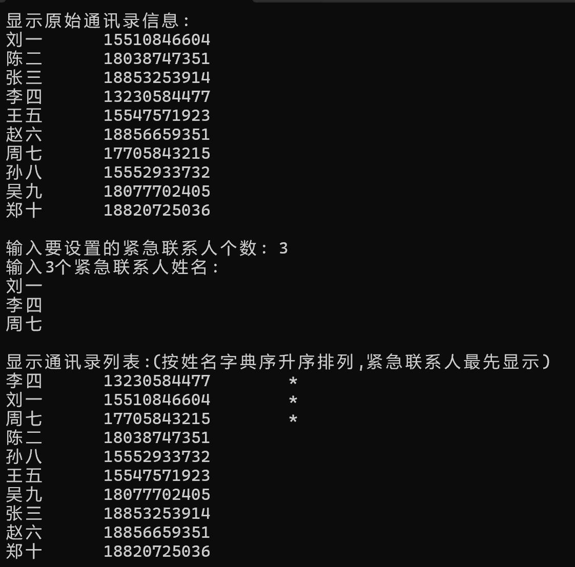 1 #include <stdio.h> 2 #include <string.h> 3 4 typedef struct { 5 char name[20]; 6 char phone[12]; 7 int vip; 8 } Contact; 9 10 void set_vip_contact(Contact x[], int n, char name[]); 11 void output(Contact x[], int n); 12 void display(Contact x[], int n); 13 14 #define N 10 15 int main() { 16 Contact list[N] = {{"刘一", "15510846604", 0}, 17 {"陈二", "18038747351", 0}, 18 {"张三", "18853253914", 0}, 19 {"李四", "13230584477", 0}, 20 {"王五", "15547571923", 0}, 21 {"赵六", "18856659351", 0}, 22 {"周七", "17705843215", 0}, 23 {"孙八", "15552933732", 0}, 24 {"吴九", "18077702405", 0}, 25 {"郑十", "18820725036", 0}}; 26 int vip_cnt, i; 27 char name[20]; 28 29 printf("显示原始通讯录信息: \n"); 30 output(list, N); 31 32 printf("\n输入要设置的紧急联系人个数: "); 33 scanf("%d", &vip_cnt); 34 35 printf("输入%d个紧急联系人姓名:\n", vip_cnt); 36 for(i = 0; i < vip_cnt; ++i) { 37 scanf("%s", name); 38 set_vip_contact(list, N, name); 39 } 40 41 printf("\n显示通讯录列表:(按姓名字典序升序排列,紧急联系人最先显示)\n"); 42 display(list, N); 43 44 return 0; 45 } 46 47 void set_vip_contact(Contact x[], int n, char name[]) { 48 int i; 49 for (i = 0; i < n; i++) { 50 if (strcmp(x[i].name, name) == 0) { 51 x[i].vip = 1; 52 } 53 } 54 } 55 56 void display(Contact x[], int n) { 57 Contact t; 58 int i,j; 59 for (i = 0; i < n - 1; i++) { 60 for (j = 0; j < n - i - 1; j++) { 61 if (x[j].vip < x[j + 1].vip) { 62 t = x[j]; 63 x[j] = x[j + 1]; 64 x[j + 1] = t; 65 } else if (x[j].vip == x[j + 1].vip && strcmp(x[j].name, x[j + 1].name) > 0) { 66 t = x[j]; 67 x[j] = x[j + 1]; 68 x[j + 1] = t; 69 } 70 } 71 } 72 output(x, n); 73 } 74 75 void output(Contact x[], int n) { 76 int i; 77 78 for(i = 0; i < n; ++i) { 79 printf("%-10s%-15s", x[i].name, x[i].phone); 80 if(x[i].vip) 81 printf("%5s", "*"); 82 printf("\n"); 83 } 84 }
