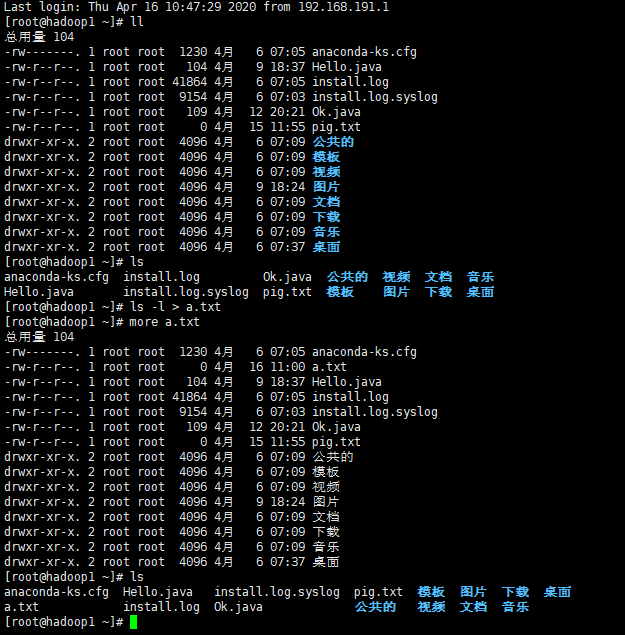 将ls -l 显示的内容覆盖写入到a.txt中:如果改文件不存在,则创建该文件。