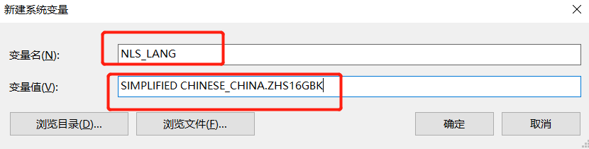 变量名:NLS_LANG 变量值:SIMPLIFIED CHINESE_CHINA.ZHS16GBK