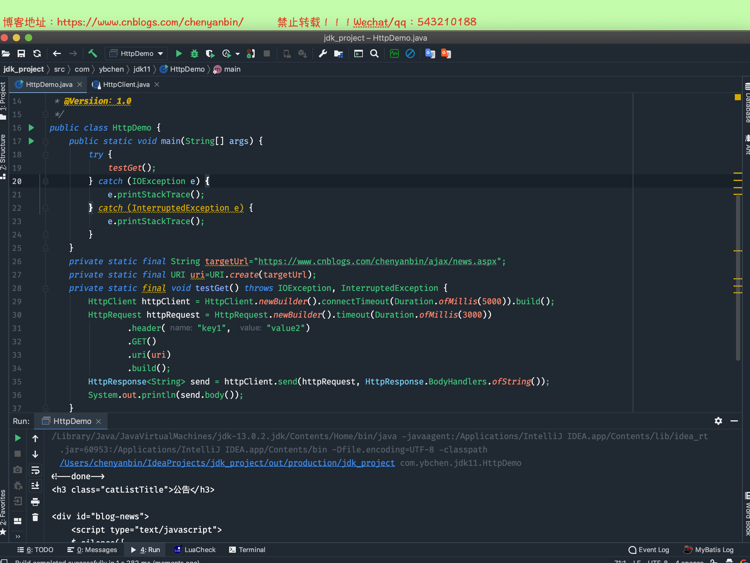 package com.ybchen.jdk11; import java.io.IOException; import java.net.URI; import java.net.http.HttpClient; import java.net.http.HttpRequest; import java.net.http.HttpResponse; import java.time.Duration; import java.util.concurrent.CompletableFuture; import java.util.concurrent.ExecutionException; /** * @Description: * @Author:chenyanbin * @Date:2020/12/24 9:17 下午 * @Versiion:1.0 */ public class HttpDemo { public static void main(String[] args) throws InterruptedException, ExecutionException, IOException { testAsynGet(); } private static final String targetUrl="https://www.cnblogs.com/chenyanbin/ajax/news.aspx"; private static final URI uri=URI.create(targetUrl); private static final void testAsynGet() throws IOException, InterruptedException, ExecutionException { HttpClient httpClient = HttpClient.newBuilder().connectTimeout(Duration.ofMillis(5000)).build(); HttpRequest httpRequest = HttpRequest.newBuilder().timeout(Duration.ofMillis(3000)) .header("key1", "value2") .GET() .uri(uri) .build(); CompletableFuture<String> stringCompletableFuture = httpClient .sendAsync(httpRequest, HttpResponse.BodyHandlers.ofString()) .thenApply(HttpResponse::body); System.out.println(stringCompletableFuture.get()); } }