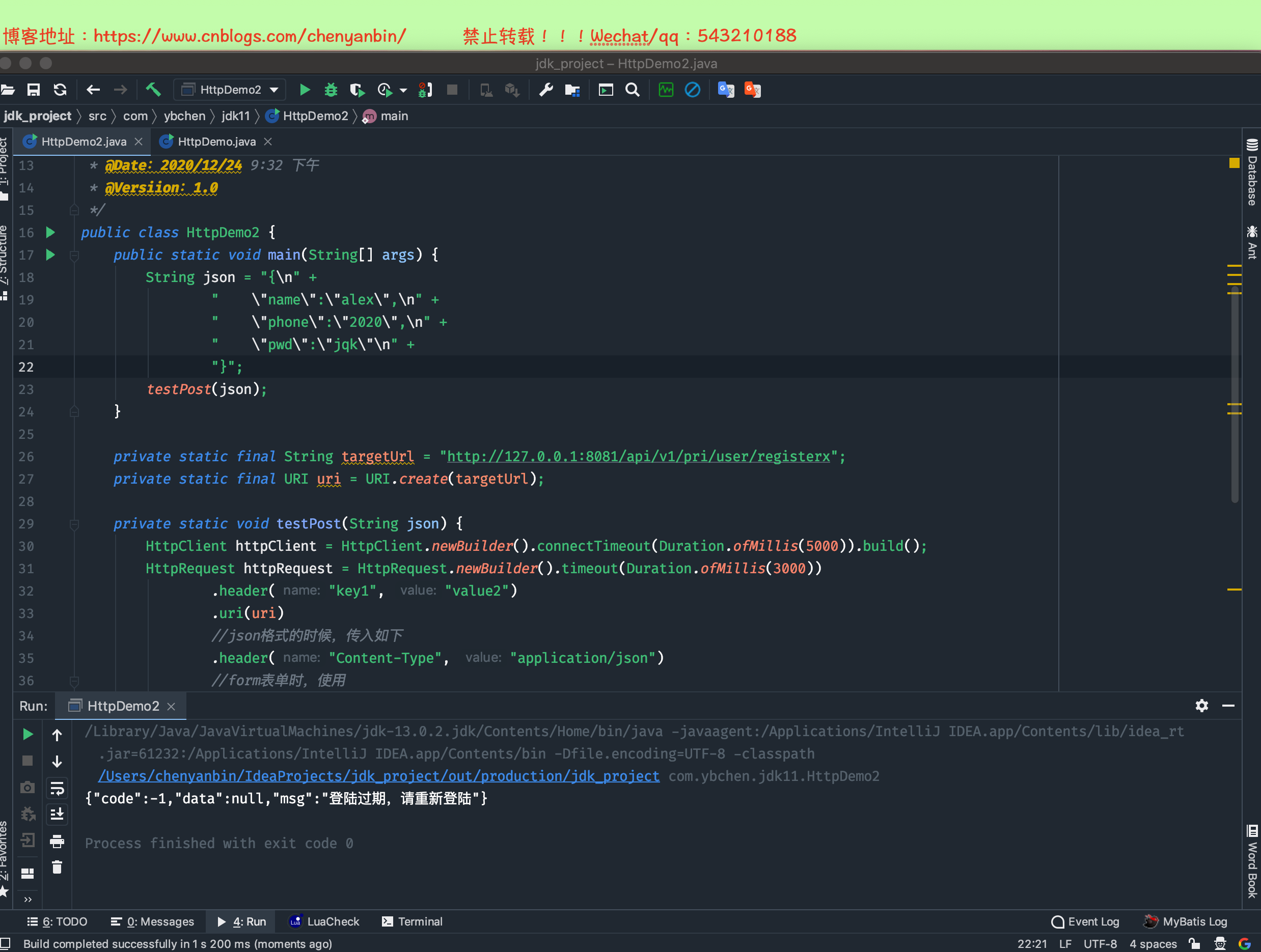 package com.ybchen.jdk11; import java.io.IOException; import java.net.URI; import java.net.http.HttpClient; import java.net.http.HttpRequest; import java.net.http.HttpResponse; import java.time.Duration; /** * @Description: * @Author:chenyanbin * @Date:2020/12/24 9:32 下午 * @Versiion:1.0 */ public class HttpDemo2 { public static void main(String[] args) { String json = "{\n" + " \"name\":\"alex\",\n" + " \"phone\":\"2020\",\n" + " \"pwd\":\"jqk\"\n" + "}"; testPost(json); } private static final String targetUrl = "http://127.0.0.1:8081/api/v1/pri/user/registerx"; private static final URI uri = URI.create(targetUrl); private static void testPost(String json) { HttpClient httpClient = HttpClient.newBuilder().connectTimeout(Duration.ofMillis(5000)).build(); HttpRequest httpRequest = HttpRequest.newBuilder().timeout(Duration.ofMillis(3000)) .header("key1", "value2") .uri(uri) //json格式的时候,传入如下 .header("Content-Type", "application/json") //form表单时,使用 // .header("Content-Type","application/x-www-form-urlencoded") // .POST(HttpRequest.BodyPublishers.ofString("name=123&pwd=456")) .POST(HttpRequest.BodyPublishers.ofString(json)) .build(); try { HttpResponse<String> send = httpClient.send(httpRequest, HttpResponse.BodyHandlers.ofString()); System.out.println(send.body()); } catch (IOException e) { e.printStackTrace(); } catch (InterruptedException e) { e.printStackTrace(); } } }