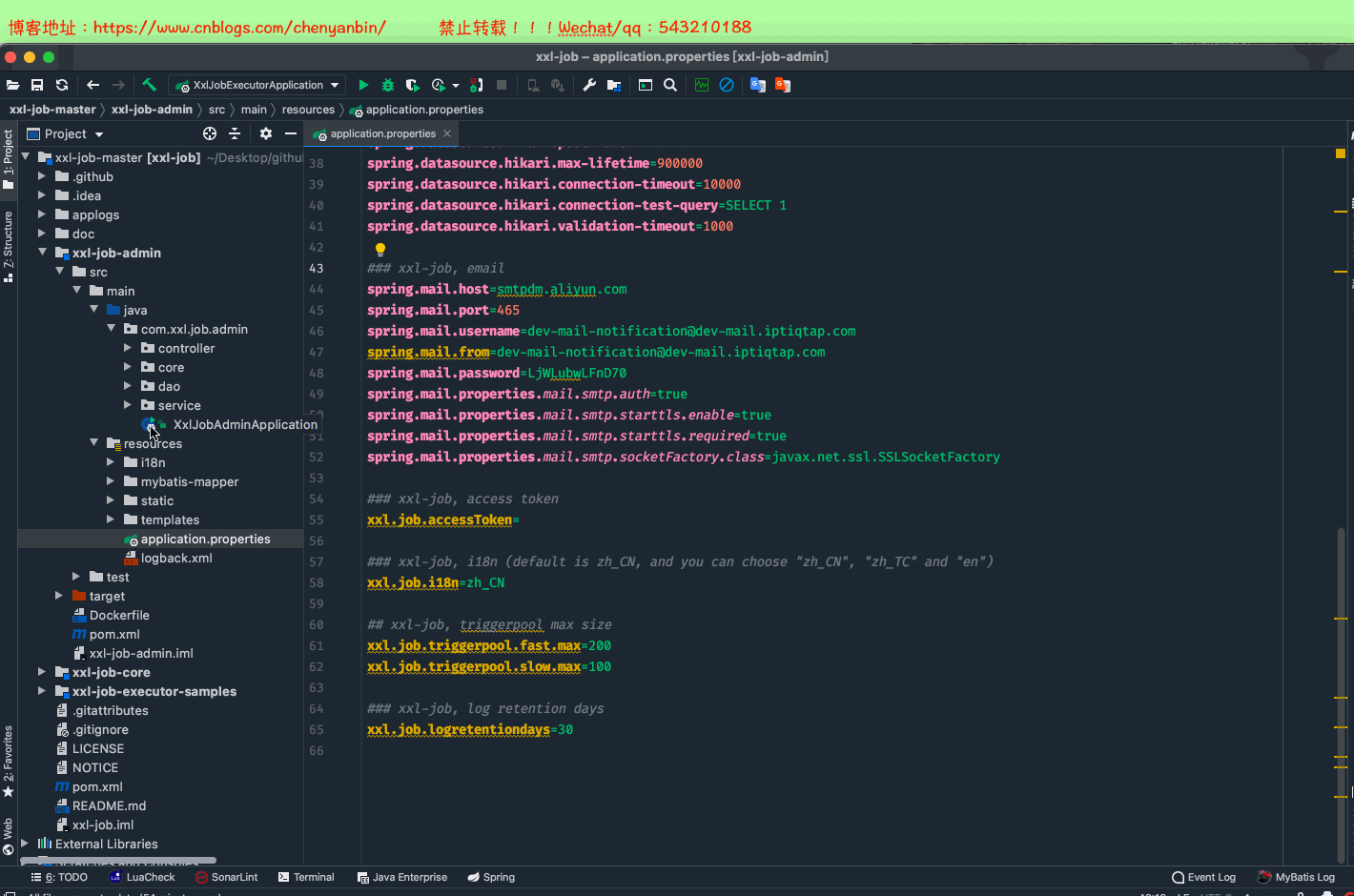 ### 调度中心JDBC链接:链接地址请保持和 2.1章节 所创建的调度数据库的地址一致 spring.datasource.url=jdbc:mysql://127.0.0.1:3306/xxl_job?useUnicode=true&characterEncoding=UTF-8&autoReconnect=true&serverTimezone=Asia/Shanghai spring.datasource.username=root spring.datasource.password=root_pwd spring.datasource.driver-class-name=com.mysql.jdbc.Driver ### 报警邮箱 spring.mail.host=smtp.qq.com spring.mail.port=25 spring.mail.username=xxx@qq.com spring.mail.password=xxx spring.mail.properties.mail.smtp.auth=true spring.mail.properties.mail.smtp.starttls.enable=true spring.mail.properties.mail.smtp.starttls.required=true spring.mail.properties.mail.smtp.socketFactory.class=javax.net.ssl.SSLSocketFactory ### 调度中心通讯TOKEN [选填]:非空时启用; xxl.job.accessToken= ### 调度中心国际化配置 [必填]: 默认为 "zh_CN"/中文简体, 可选范围为 "zh_CN"/中文简体, "zh_TC"/中文繁体 and "en"/英文; xxl.job.i18n=zh_CN ## 调度线程池最大线程配置【必填】 xxl.job.triggerpool.fast.max=200 xxl.job.triggerpool.slow.max=100 ### 调度中心日志表数据保存天数 [必填]:过期日志自动清理;限制大于等于7时生效,否则, 如-1,关闭自动清理功能; xxl.job.logretentiondays=30