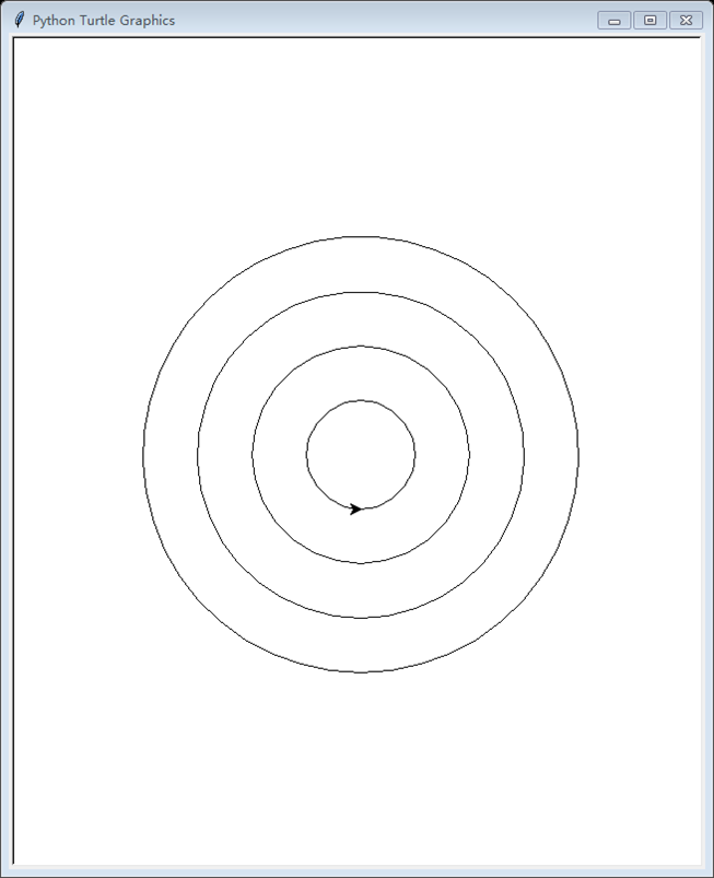 >>> import turtle >>> turtle.up() >>> turtle.goto(0,-200) >>> turtle.down() >>> turtle.circle(200) >>> turtle.up() >>> turtle.goto(0,-150) >>> turtle.down() >>> turtle.circle(150) >>> turtle.up() >>> turtle.goto(0,-100) >>> turtle.down() >>> turtle.circle(100) >>> turtle.up() >>> turtle.goto(0,-50) >>> turtle.down() >>> turtle.circle(50)