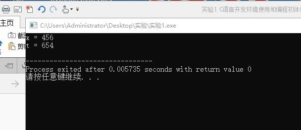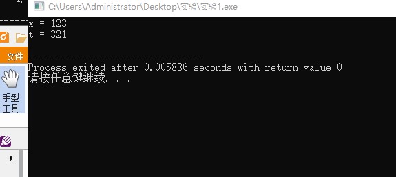 #include <stdio.h> int main() { int x, t, m; x = 123; printf("x = %d\n", x); t = 0; m = x % 10; t = t *10 + m; x = x / 10; m = x % 10; t = t * 10 + m; x = x / 10; m = x % 10; t = t * 10 + m; x = x / 10; printf("t = %d\n", t); return 0; }
