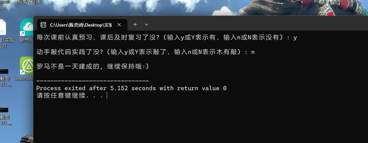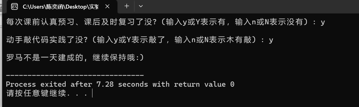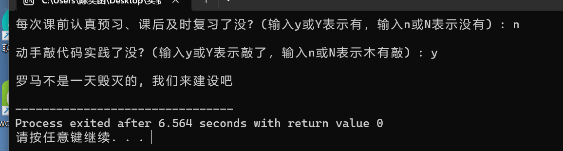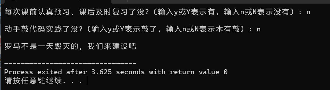 #include <stdio.h> int main() { char ans1, ans2; printf("每次课前认真预习、课后及时复习了没? (输入y或Y表示有,输入n或N表示没有) : "); ans1 = getchar(); getchar(); printf("\n动手敲代码实践了没? (输入y或Y表示敲了,输入n或N表示木有敲) : "); ans2 = getchar(); if ((ans1=='Y'||ans1=='y')&&( ans2='y'||ans2=='Y')) printf("\n罗马不是一天建成的, 继续保持哦:)\n"); else printf("\n罗马不是一天毁灭的, 我们来建设吧\n"); return 0; }