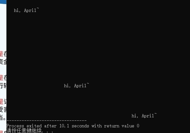 #include <stdio.h> #include <stdlib.h> #include <time.h> #include <unistd.h> #define N 80 void print_text(int line, int col, char text[]); // 函数声明 void print_spaces(int n); // 函数声明 void print_blank_lines(int n); // 函数声明 int main() { int line, col, i; char text[N] = "hi, April~"; srand(time(0)); // 以当前系统时间作为随机种子 for(i = 1; i <= 10; ++i) { line = rand() % 25; col = rand() % 80; print_text(line, col, text); sleep(1); // 暂停1000ms } return 0; } void print_spaces(int n) { int i; for(i = 1; i <= n; ++i) printf(" "); } void print_blank_lines(int n) { int i; for(i = 1; i <= n; ++i) printf("\n"); } // 在第line行第col列打印一段文本 void print_text(int line, int col, char text[]) { print_blank_lines(line-1); // 打印(line-1)行空行 print_spaces(col-1); // 打印(col-1)列空格 printf("%s", text); // 在第line行、col列输出text中字符串 }