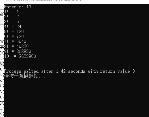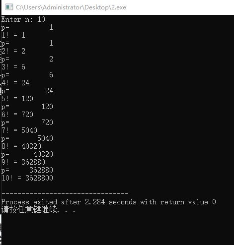 clude <stdio.h> long long fac(int n); // 函数声明 int main() { int i, n; printf("Enter n: "); scanf("%d", &n); for (i = 1; i <= n; ++i) printf("%d! = %lld\n", i, fac(i)); return 0; } long long fac(int n) { static long long p = 1; prntf("p=%11d\n",p);//新增的一行 p = p * n; return p; }