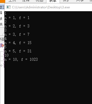 #include <stdio.h> long long func(int n); // 函数声明 int main() { int n; long long f; while (scanf("%d", &n) != EOF) { f = func(n); // 函数调用 printf("n = %d, f = %lld\n", n, f); } return 0; } long long func(int n){ int ans=1 ,i; long long f; for(i=1;i<=n;i++){ ans=ans*2; } f=ans-1; return f; }