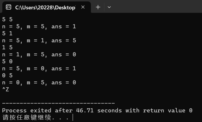 #include <stdio.h> int func(int n, int m); int main() { int n, m; while (scanf("%d%d", &n, &m) != EOF) printf("n = %d, m = %d, ans = %d\n", n, m, func(n, m)); return 0; } int func(int n, int m){ if (m>n) return 0; if (m==n) return 1; if (m==0) return 1; return func(n-1,m)+func(n-1,m-1); }