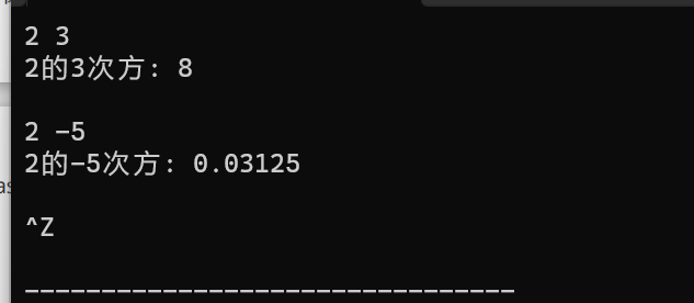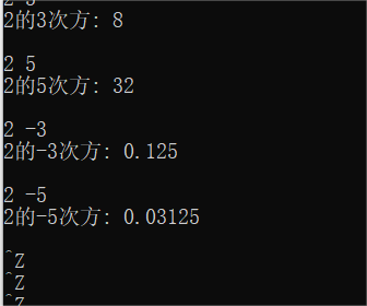 #include <stdio.h> double mypow(int x, int y); int main() { int x, y; double ans; while (scanf_s("%d%d", &x, &y) != EOF) { ans = mypow(x, y); printf("%d的%d次方: %g\n\n", x, y, ans); } return 0; } double mypow(int x, int y) { int t; t = 1; double ans; ans = 1; if(y>=0) { while(t<=y) { ans = ans * x; t = t + 1; } } else { while(t<=-y) { ans = ans / x; t = t + 1; } } return ans; }