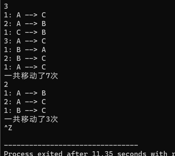 #include<stdio.h> #include<stdlib.h> void hanoi(unsigned int n,char from,char temp,char to);//递归函数声明 void moveplate(unsigned int n,char from,char to); //移动函数声明 int time; int mian(){ unsigned int n; while (scanf("%u",&n) !=EOF){//输入盘子数目 time = 0; hanoi(n,'A','B','C'); printf("一共移动了%d次",time); } system("pause"); return 0; } void hanoi(unsigned int n,char from,char temp,char to){ if(n==1) moveplate(n,from,to); else { hanoi(n-1,from,to,temp);//将n-1个盘子从A以C为中心转移到B上 moveplate(n,from,to); //将盘子n从A移到C上 hanoi(n-1,temp,from,to);//将n-1个盘子从B以A为中转移到C上 } } void moveplate(unsigned int n,char from,char to){ printf("%u:%c-->%c\n",n,from,to); time++; }