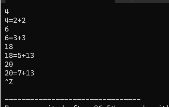 #include <stdafx.h> #include <stdio.h> #include <cmath> #include <stdlib.h> int is_prime(int n); int main() { int i,k,a[15],j=0,l; for(k=2;k<=20;k++) { if(is_prime(k)) a[j++]=k; } for(i=2;i<=10;i++) for(l=1;l<=10;l++) if (is_prime(2*i-a[l-1])){ printf("%d = %d + %d\n",(2*i),a[l-1],(2*i-a[l-1]));break; } system("pause"); return 0; } int is_prime(int n) { int i,flag=1; int sql = sqrt(1.0*n); for(i=2;i <= sql;i++) { if(n%i==0) {flag=0;break;} } return flag; }