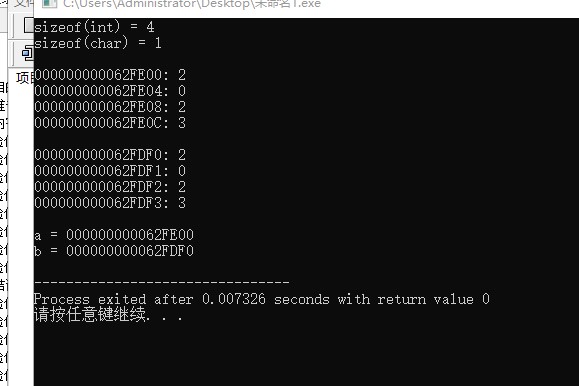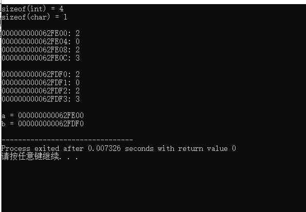 #include <stdio.h> #define N 4 int main() { int a[N] = {2, 0, 2, 3}; char b[N] = {'2', '0', '2', '3'}; int i; printf("sizeof(int) = %d\n", sizeof(int)); printf("sizeof(char) = %d\n", sizeof(char)); printf("\n"); // 输出int型数组a中每个元素的地址、值 for (i = 0; i < N; ++i) printf("%p: %d\n", &a[i], a[i]); printf("\n"); // 输出char型数组b中每个元素的地址、值 for (i = 0; i < N; ++i) printf("%p: %c\n", &b[i], b[i]); printf("\n"); // 输出数组名a和b对应的值 printf("a = %p\n", a); printf("b = %p\n", b); return 0; }