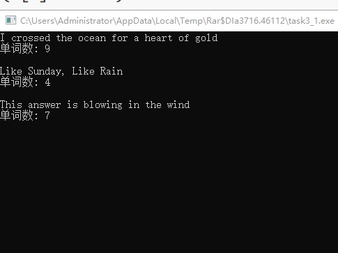 #include <stdio.h> #define N 80 int count(char x[]); int main() { char words[N+1]; int n; while(gets(words) != NULL) { n = count(words); printf("单词数: %d\n\n", n); } return 0; } int count(char x[]) { int i; int word_flag = 0; // 用作单词标志,一个新单词开始,值为1;单词结束,值为0 int number = 0; // 统计单词个数 for(i = 0; x[i] != '\0'; i++) { if(x[i] == ' ') word_flag = 0; else if(word_flag == 0) { word_flag = 1; number++; } } return number; }